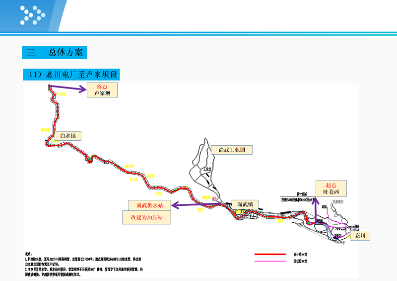 旺苍自来水改扩建工程项目设计给水管涉及新建、扩建、改建及规划布置,整体上按地理位置区分为嘉川电厂至卢家坝段、嘉川至张华镇至猪场段、老城洪江渡大桥至锦江壹号段、消防队至嘉川段四段: