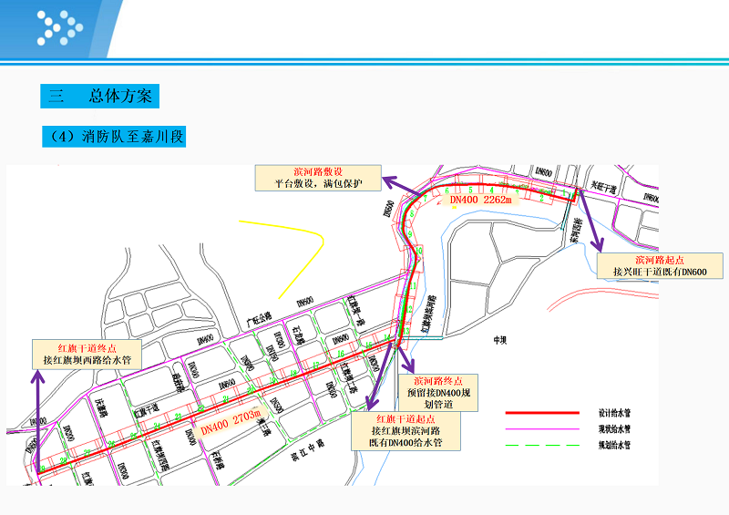 本段滨河路DN400管道起点接兴旺干道消防队交叉口既有DN600管道,在结合石龙嘴至普陀寺加油站道路扩建方案及该段新建河堤方案的情况下,设计管道沿滨河路外侧边坡平台、空地铺设,沿线按需预留接管点,终点位于滨河路与红旗干道交叉口,同时预留将来接规划DN400管道接口。红旗干道DN400管道起点位于红旗干道与滨河路交叉口,沿规划红旗干道北侧人行道下敷设至终点接红旗坝西路规划DN400给水管。