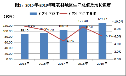 2019年全县地区生产总值(GDP)达到129.47亿元,按可比价计算,比上年增长6.1%。其中:第一产业增加值23.15亿元,增长3.1%;第二产业增加值60.9亿元,增长5.5%;第三产业增加值45.42亿元,增长8.7%。三次产业对经济增长的贡献率分别为8.5%、48.1%、43.3%,分别拉动经济增长0.5、2.9、2.6个百分点。
