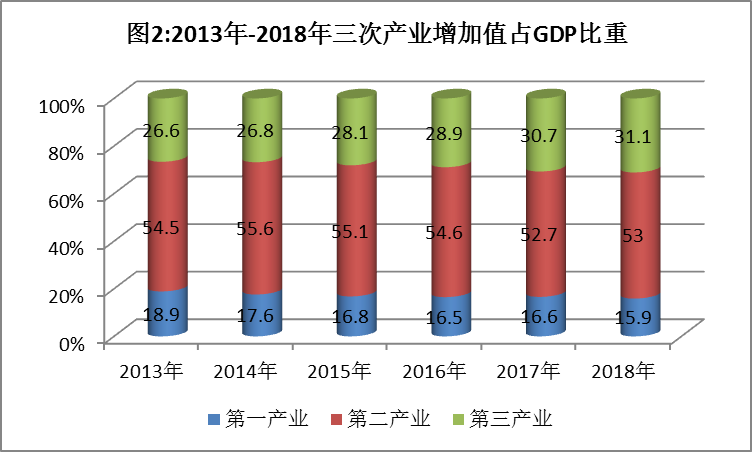 第一、二、三产业的结构比由上年的16.6:52.7:30.7调整为15.9:53:31.1,第二产业和第三产业比重比上年分别提高了0.3、0.4个百分点,第一产业比重下降0.7个百分点。