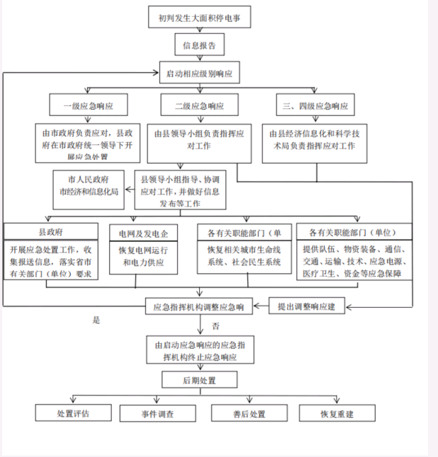 大面积停电事件应对工作坚持统一领导、综合协调,属地为主、分工负责,保障民生、维护安全,全社会共同参与的原则。大面积停电事件发生后,县、乡(镇)人民政府、县级有关部门、电力企业(包括供电企业、发电企业等,下同)、重要电力用户应立即按照职责分工和相关预案开展处置工作。