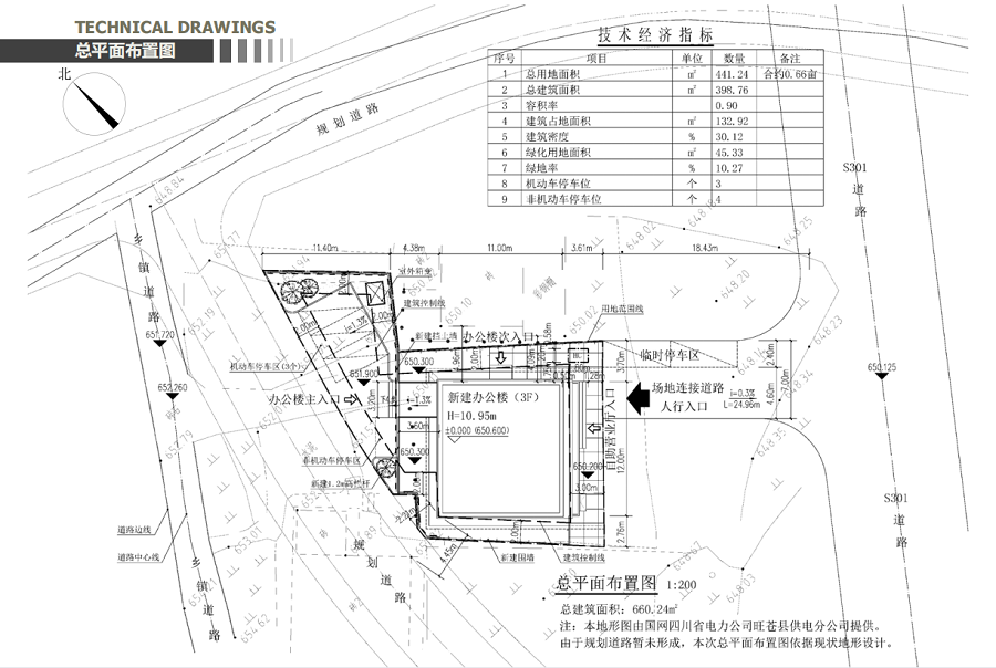 拟建方案总经济技术指标为:用地面积441.24㎡;总建筑面积398.76㎡;建筑占地面积132.92㎡;容积率0.9;建筑密度30.12%;绿化用地面积45.33㎡,绿地率10.27%;建筑高度10.95米;机动车车位3个,非机动车车位4个。