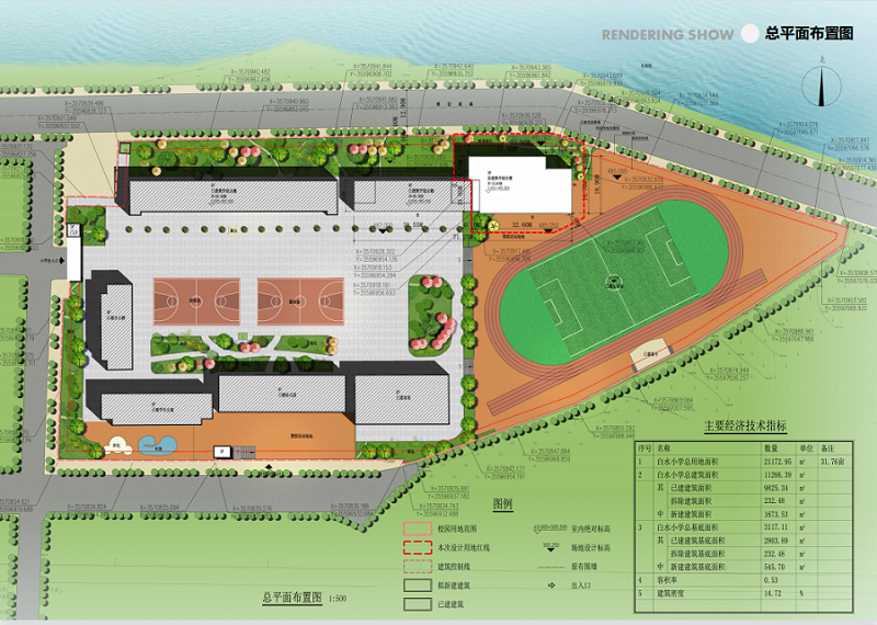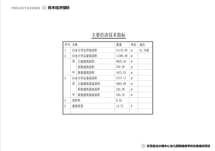 拟建方案总经济技术指标为:用地面积21172.95㎡;总建筑面积11266.39㎡,其中已建建筑面积9825.34㎡,拆除建筑232.48㎡,新建建筑面积1673.53㎡;建筑占地面积3117.11㎡,其中已建建筑占地面积2803.89㎡,拆除建筑占地232.48㎡,新建建筑占地面积545.70㎡;容积率0.53;建筑密度14.72%。