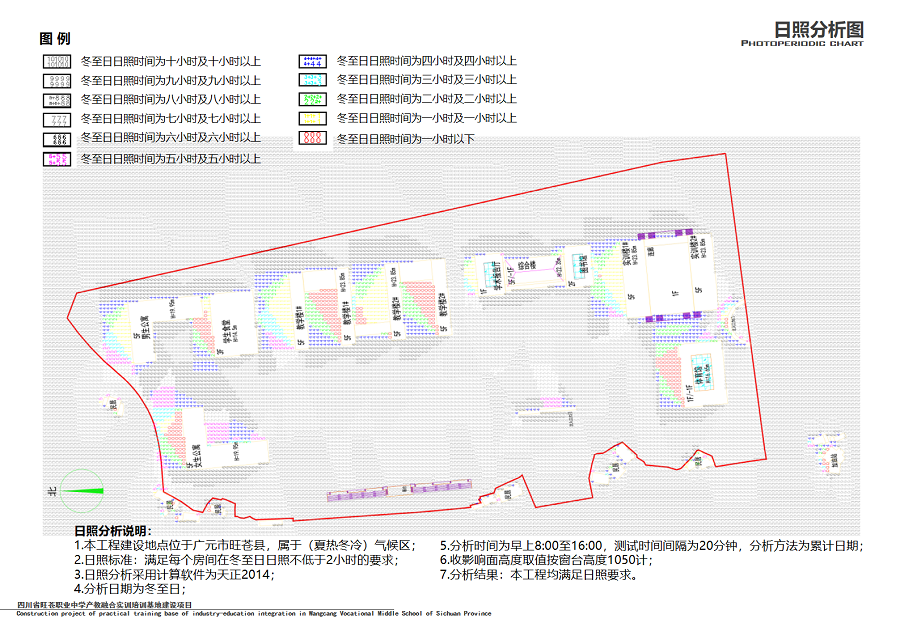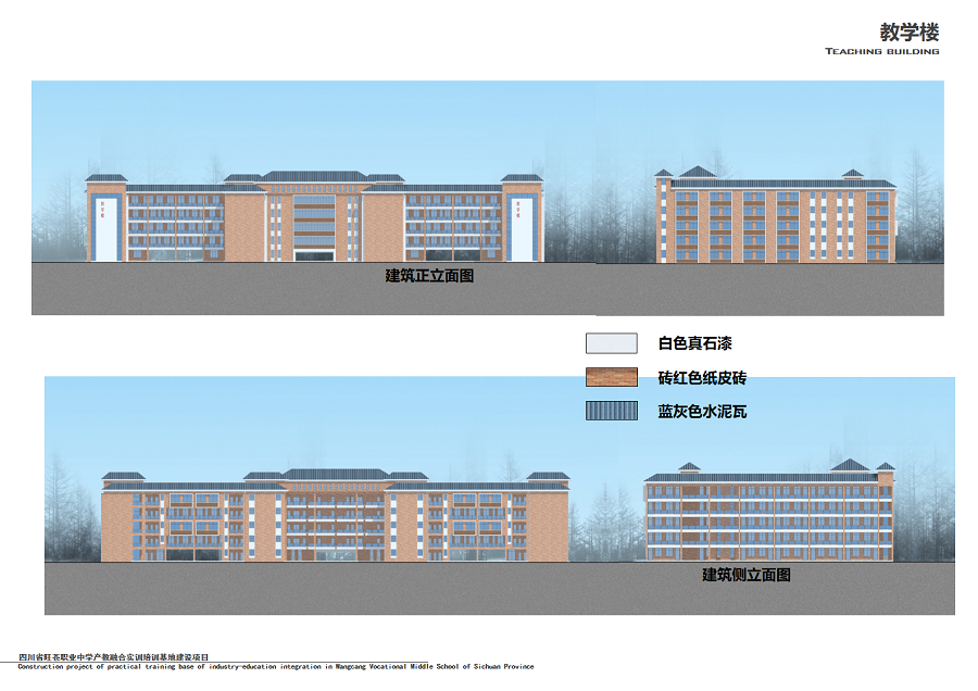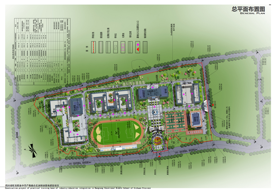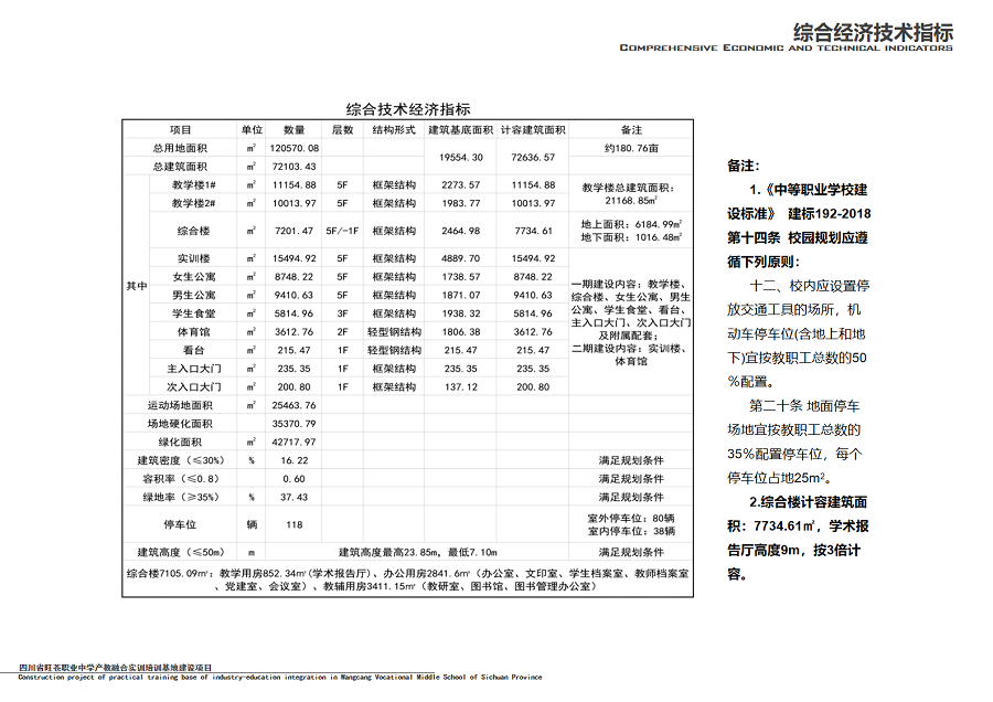 拟建方案经济技术指标为:用地面积120570.08㎡;总建筑面积72103.43㎡,其中地上建筑面积71,086.95㎡(教学楼21168.85㎡,教综合楼6184.99㎡,实训楼15494.92㎡,女生公寓8748.22㎡,男生公寓9410.63㎡,学生食堂5814.96㎡,体育馆3612.76㎡,看台215.47㎡,主入口大门235.35㎡,次入口大门200.8㎡),地下建筑1016.48㎡;建筑占地面积19554.30㎡;计容建筑面积72632.57㎡;容积率0.60;建筑密度16.22%;绿地率37.43%;机动车停车位118辆(地上80辆,室内38辆);建筑高度≤23.85米。