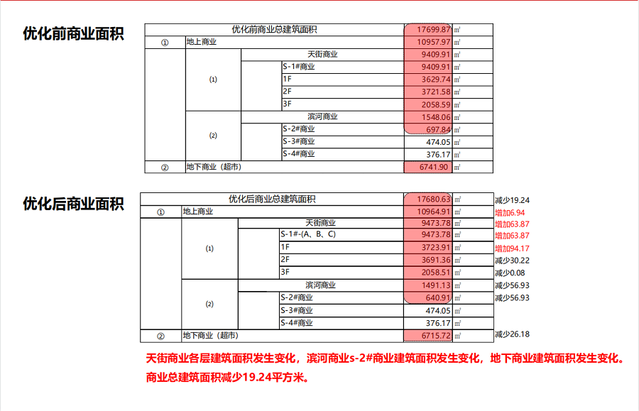 调整后商业指标为:商业总建筑面积17680.63㎡;地上商业10964.91㎡,其中,天街商业9473.78㎡,滨河商业1491.13㎡;地下商业(超市)6715.72㎡。