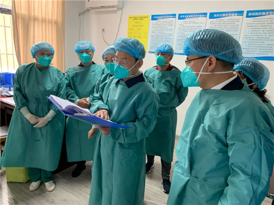 唐文辉一行先后到磨岩医学集中隔离点、张华敬老院隔离点和县中医医院等点位进行督导检查。每到一处,唐文辉都认真听取情况汇报,详细了解闭环管控措施落实、各项记录台账、隔离人员生活保障等情况,向防疫一线的工作人员表示慰问和感谢,并就环境消杀、服务保障以及工作人员安全防护措施等提出具体要求。