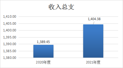2021年度收支总计1404.38万元,2020年度收支总计1389.45万元。与2020年相比,收支总计增加14.93万元,上升0.01%。
