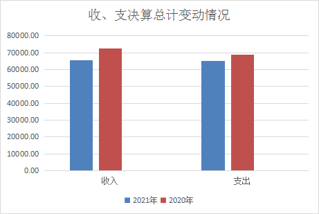 2021年度收入总计65473.69万元、支出总计65273.98万元。与2020年相比,收入减少7037.38万元、下降9.71%,支出总计减少3422万元,下降4.98%。主要变动原因是财政抗疫国债等资金减少,同时厉行节约减少开支。
