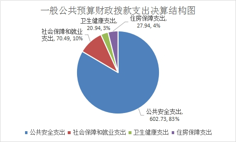 2021年一般公共预算财政拨款支出722.11万元,主要用于以下方面:公共安全支出(类)支出602.73万元,占83%;社会保障和就业(类)支出70.49万元,占10%;卫生健康支出20.94万元,占3%;住房保障支出27.94万元,占4%。
