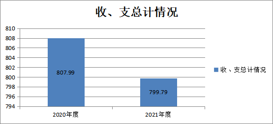 2021年度收、支总计799.79万元。与2020年相比,收、支总计各减少8.2万元,下降1.01%。主要变动原因是本年度病故1人,“三公”经费支出减少。