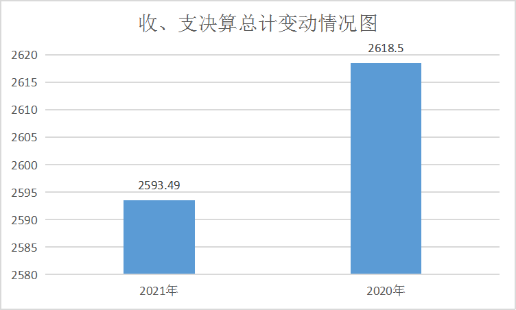 2021年度收、支总计2593.49万元。与2020年相比,收、支总计各增加/减少25.01万元,下降0.96%。主要变动原因是2021年人员退休,人员经费减少以及厉行节约,压减各项费用支出。
