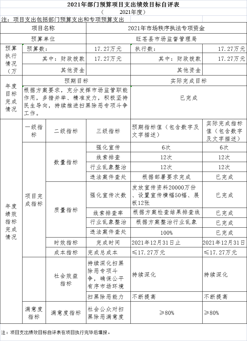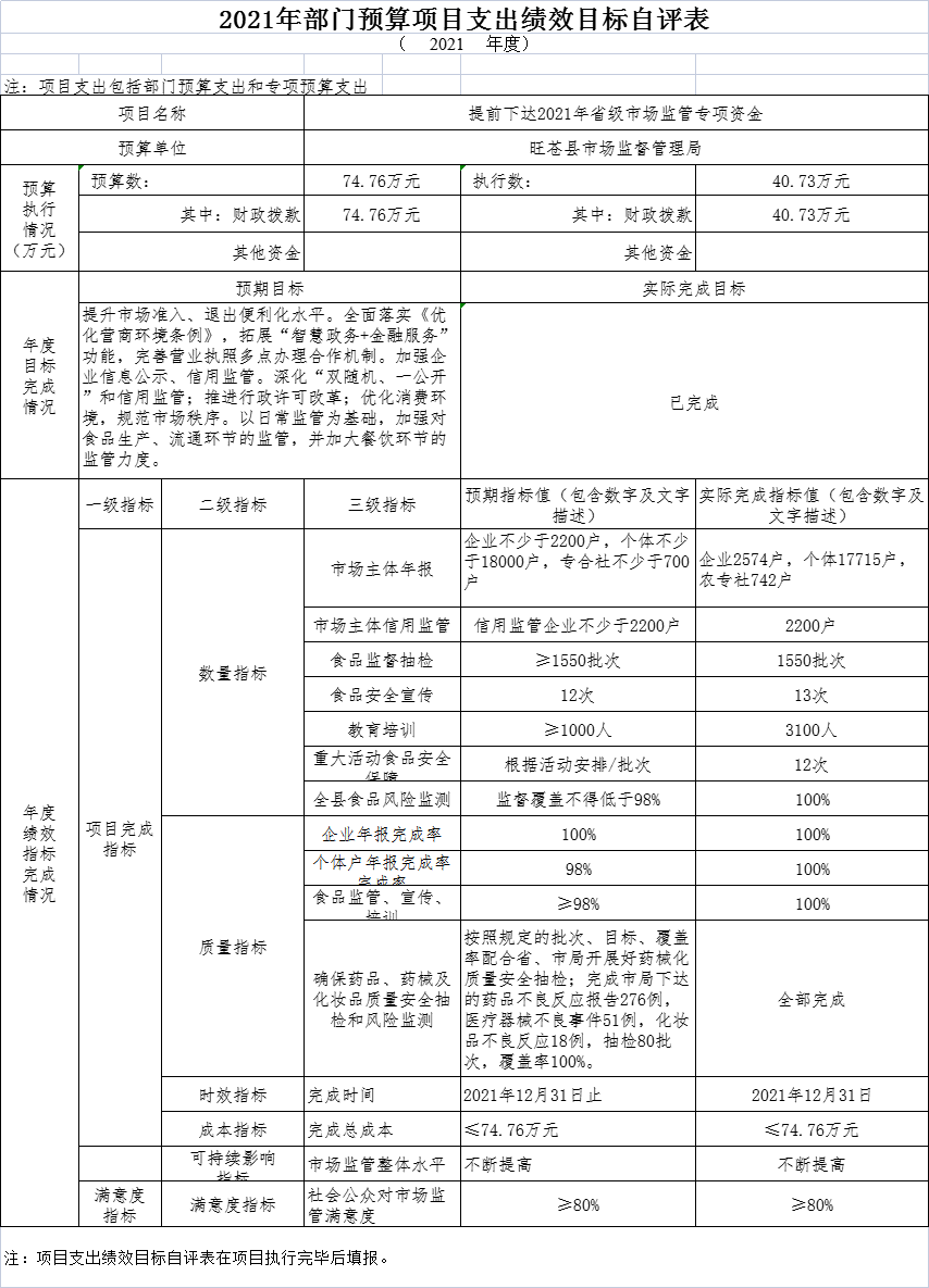 根据预算绩效管理要求,本单位在2021年度预算编制阶段,组织对党组织活动经费(含纪检监察经费)、扫黑除恶经费以及提前下达2021年省级市场监管专项资金等三个项目编制了绩效目标,预算执行过程中,选取3个项目开展绩效监控,年终执行完毕后,对5个项目开展了绩效自评。同时,本部门对2021年部门整体开展绩效自评,《2021年旺苍县市场监督管理局部门整体绩效评价报告》见附件(第四部分)。