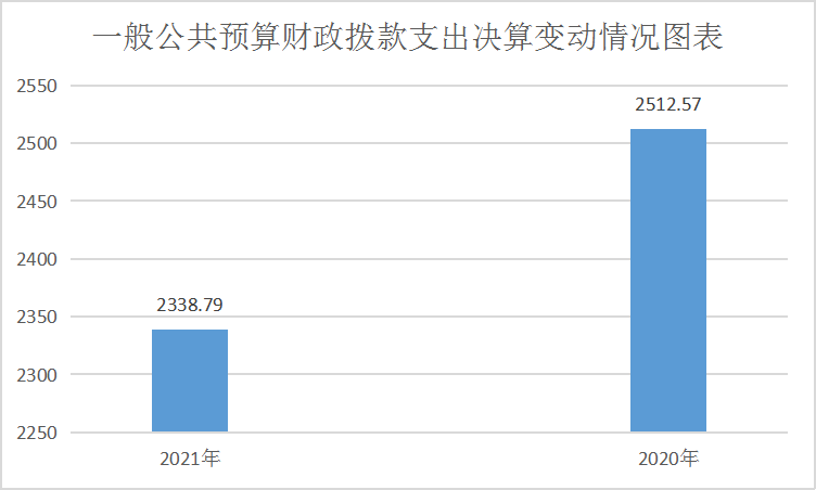 2021年一般公共预算财政拨款支出2338.79万元,占本年支出合计的100%。与2020年相比,一般公共预算财政拨款支出减少173.78万元,下降6.92%。主要变动原因是2020年年初结转结余增加,且2020年项目经费比2021年多。