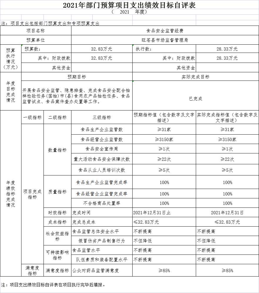 2021年我局收到食品监管补助资金共计32.83万元,上述资金旺苍县财政局已于2021年度全额拨付到我局,我局在使用过程中严格开支范围、标准及支付进度、支付依据合规合法,资金支付与预算相符。截至2021年底,食品监管工作已经完成。
