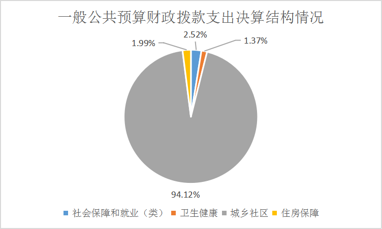 2021年一般公共预算财政拨款支出1218.35万元,主要用于以下方面:社会保障和就业(类)支出30.73万元,占2.52%;卫生健康(类)支出16.74万元,占1.37%;城乡社区(类)支出1146.67万元,占94.12%;住房保障(类)支出24.21万元,占1.99%。