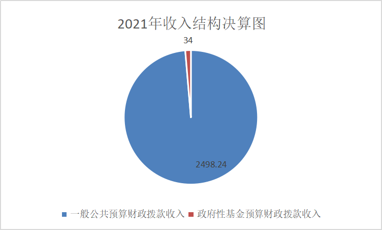 2021年本年收入合计2532.24万元,其中:一般公共预算财政拨款收入2498.24万元,占98.66%;政府性基金预算财政拨款收入34万元,占1.34%。