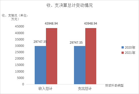 2021年度收、支总计43948.94万元。与2020年相比,收、支总计各增加14201.59万元,增长48%。主要变动原因是2021上年结转结余数增加和本年新发行其他地方自行试点项目收益专项债券收入安排的支出。