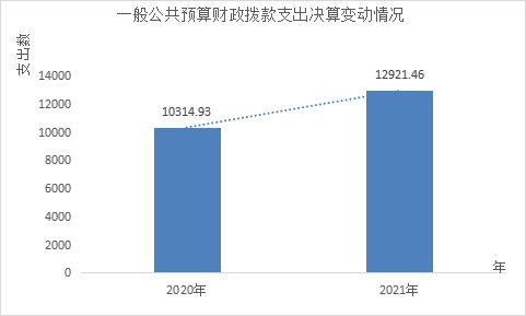 2021年一般公共预算财政拨款支出12921.46万元,占本年支出合计的49%。与2020年相比,一般公共预算财政拨款支出增加2606.53万元,增长25%。主要变动原因是项目支出增加,特别是专项债支出增加。