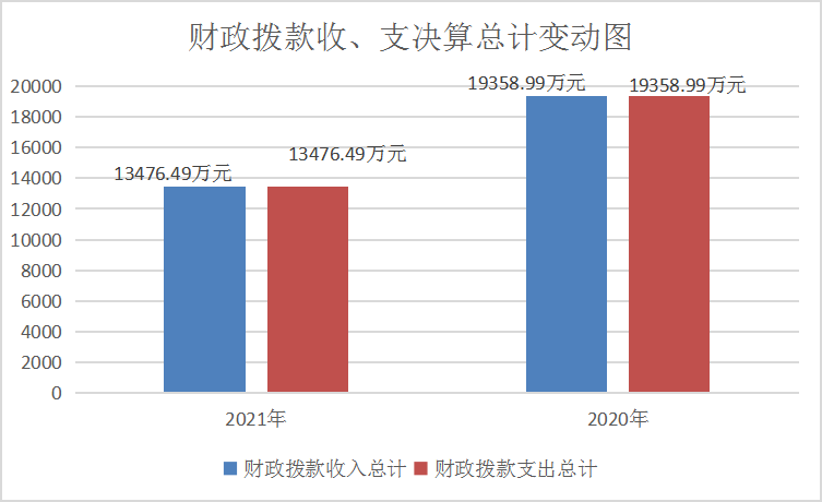 2021年财政拨款收、支总计13476.49万元。与2020年相比,财政拨款收、支总计各减少5882.5万元,下降30.39%。主要变动原因一是2021年乡(镇)人力资源和社会保障服务所机构划转到乡(镇),人员整体划转到乡(镇),减少97的人员经费及人头工作经费预算;二是三支一扶人员减少;三是行政单位离退休费支出减少。
