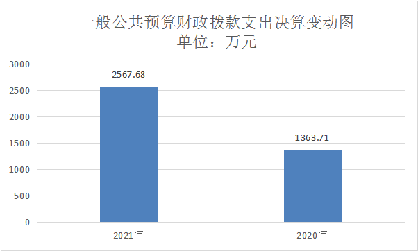 2021年一般公共预算财政拨款支出2567.68万元,占本年支出合计的100%。与2020年相比,一般公共预算财政拨款支出增加1203.97万元,增长89%。主要变动原因是一是新招录1名参公干部,公用经费就相应的增加;二是其他就业补助资金支出增多;三是新增了工业企业结构调整奖补资金。