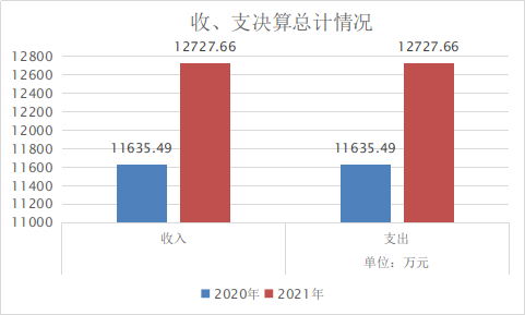 2021年度收、支总计12727.66万元。与2020年相比,收、支总计各增加876.72万元,增长0.75%。主要变动原因是主要是保障性住房资金、人员经费增加导致。
