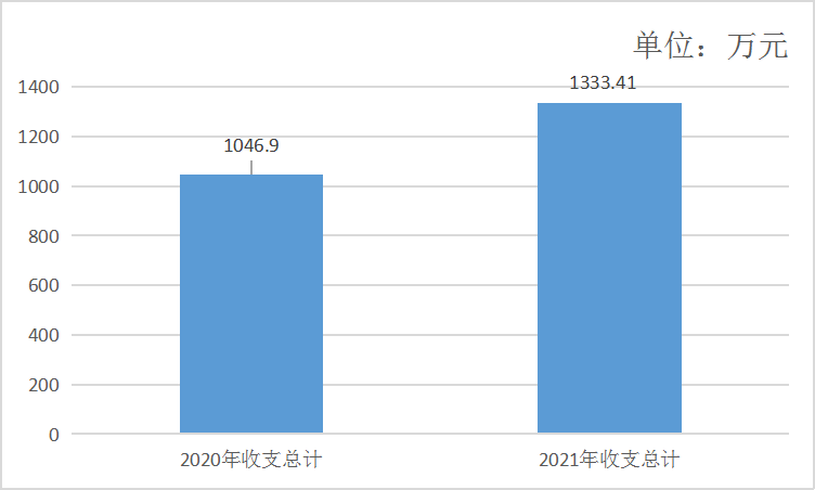 2021年度收、支总计1333.41万元。与2020年相比,收入增加286.51万元,增长27.37%。支出总计增加181.57万元,增长34.37%。主要变动原因是2021年职工人数增加。