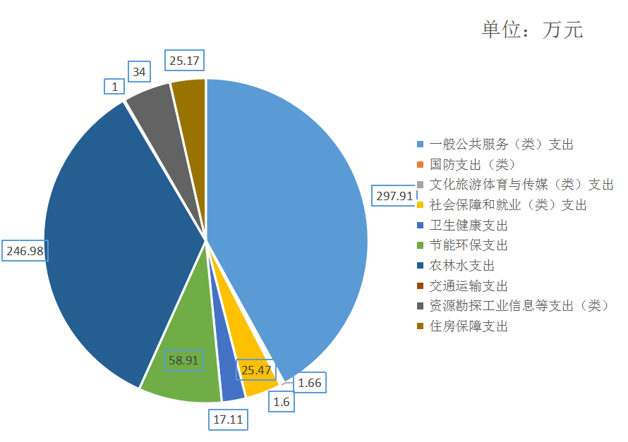 2021年一般公共预算财政拨款支出709.81万元,主要用于以下方面:一般公共服务(类)支出297.91万元,占41.97%;国防支出(类)1.60万元,占0.23%;文化旅游体育与传媒(类)支出1.66万元,占0.23%;社会保障和就业(类)支出25.47万元,占3.59%;卫生健康支出17.11万元,占2.41%;节能环保支出58.91万元,占8.30%;农林水支出246.98万元,占34.80%;交通运输支出1.00万元,占0.14%;资源勘探工业信息等支出(类)34.00万元,占4.8%;住房保障支出25.17万元,占3.55%。