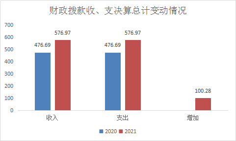 2021年财政拨款收、支总计576.97万元。与2020年相比,财政拨款收、支总计各增加/减少100.28万元,增长21.04%。主要变动原因是人员经费和项目经费增加。