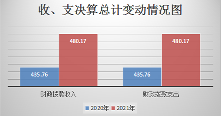 2021年度收、支总计480.17万元。与2020年相比,收、支总计增加44.41万元,增长10.19%。主要变动原因是人员增加4人。