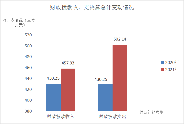 2021年财政拨款收入总计457.93万元,与2020年相比增加27.68万元,增加6.43%,主要变动原因是新增人员;2021年财政拨款支出502.14万元,与2020年相比增加71.89万元,增加16.71%,主要变动原因是新增人员。