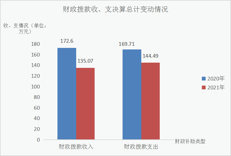 2021年财政拨款收入总计135.07万元,与2020年相比减少37.53万元,下降21.74%,主要变动原因是单位人员减少;2021年财政拨款支出144.49万元,与2020年相比减少25.22万元,下降14.86%,主要变动原因是单位人员减少。