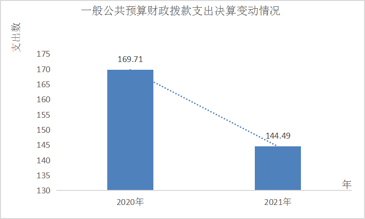 2021年一般公共预算财政拨款支出144.49万元,占本年支出合计的100%。与2020年相比,一般公共预算财政拨款支出减少25.22万元,下降14.86%。主要变动原因是单位人员减少。