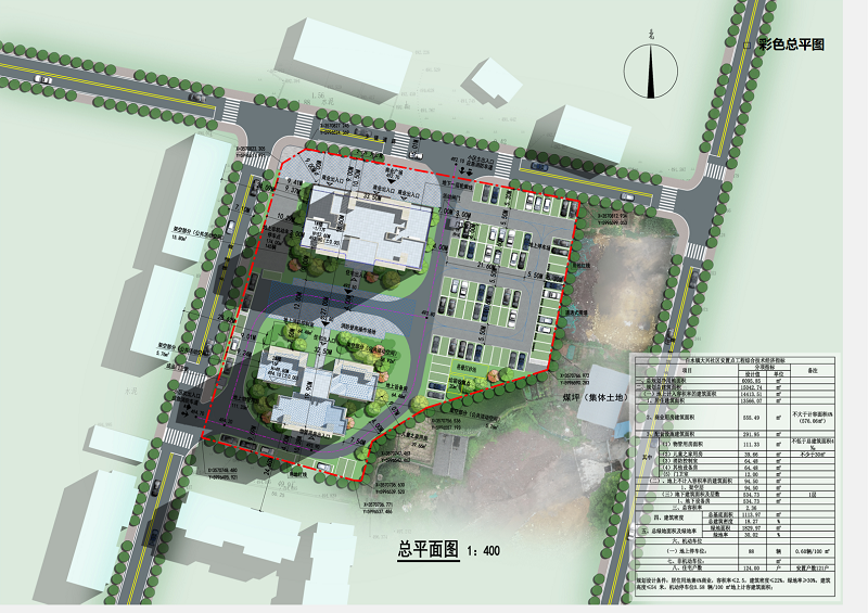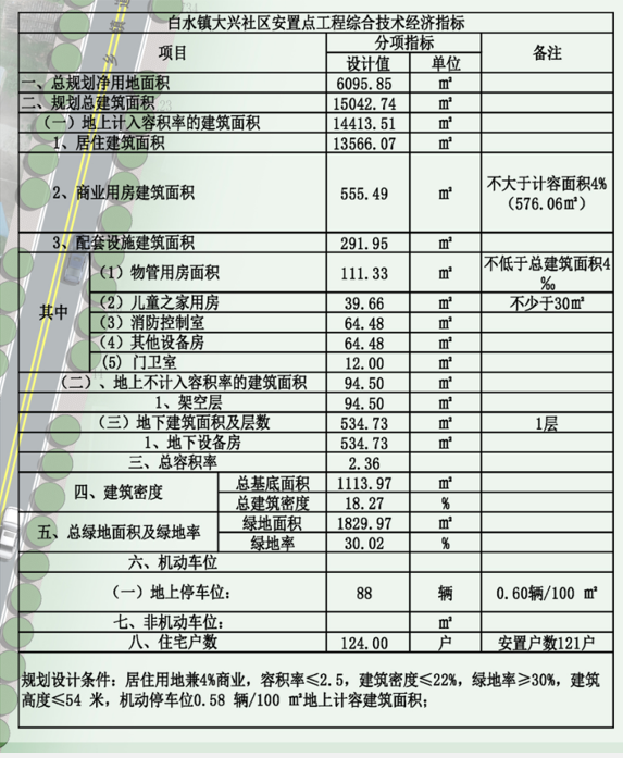 设计方案综合指标为:总规划净用地面积6095.85㎡;规划总建筑面积15042.74㎡,其中,地上计入容积率的建筑面积14413.51㎡:居住建筑面积13566.07㎡,商业用房建筑面积555.49㎡,配套设施建筑面积291.95㎡(物管用房面积111.33㎡,业主委员会议事活动用房39.66㎡,消防控制室64.48㎡,其他设备房64.48㎡,门卫室12.00㎡),地上不计入容积率的建筑面积94.5㎡(架空层);地下建筑面积及层数534.73㎡(地下设备房)1层;总容积率2.36;总基底面积1113.97㎡,总建筑密度18.27%;绿地面积1829.97㎡,绿地率30.02%;地上停车位88辆;住宅户数124户。