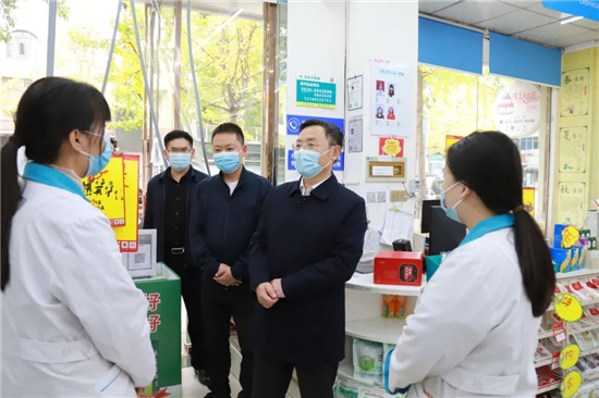 在建设路某药店,唐文辉按照要求有序测温、扫码进入店内,与一线员工详细交流,了解药品供应量、营业时间及发热、咳嗽类药品购买程序。他强调,要认真落实疫情防控措施,做好“一退两抗”药品购买信息登记工作,劝导发热病人前往正规医疗机构就诊,并及时上报相关信息,充分发挥药店的“哨点作用”,为打赢疫情防控阻击战贡献力量。