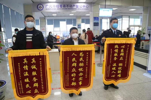 12月12日,在旺苍县人民政府政务服务中心不动产登记中心窗口,旺苍县凤凰城小区业主委员会代表将印有“为民排忧办实事,人民群众好干部。”“心系群众、排忧解难,热情服务、温暖人心。”“真诚服务群众,真情温暖民心。”三面锦旗分别送到中共旺苍县委、旺苍县人民政府,国家税务总局旺苍县税务局,旺苍县自然资源局(县不动产登记中心)等单位相关领导手中,感谢他们为群众提供热情、高效、便捷、优质的服务。县委常委、副县长王根明接过锦旗说道,“这都是我们应该做的,便民利企是我们的服务宗旨。”