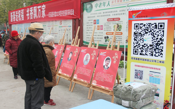 1月10日,首场活动在马家梁社区举行,县图书馆开展了“红城好人榜”图片展,并开展了推广、关注“旺苍县图书馆微信公众号”有奖活动和免费赠书活动,现场向群众赠送新书500册,文创口杯2000只,参与活动的群众近千人。