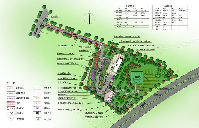 拟建方案综合总经济技术指标为:总用地面积16282.98平方米,约24.42亩;总建筑面积1083.64平方米,其中,业务用房894.64平方米(已建),辅助业务用房169平方米(新建),门卫监控室20平方米(新建);基底面积640.51平方米,建筑密度3.93%;容积率0.067;绿化率72.45%。
