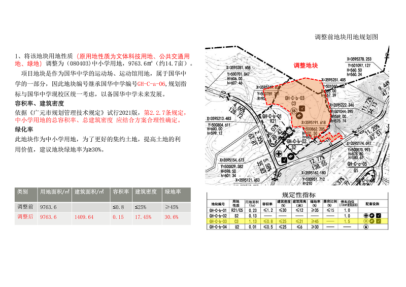 (一)用地性质调整情况:该地块用地性质(原用地性质为文体科技用地、公共交通用地、绿地)调整为(080403)中小学用地,用地面积9763.6㎡(约14.7亩)。项目地块是作为国华中学的运动场、运动馆用地,属于国华中学的一部分,因此地块编号继承国华中学编号GH-C-a-06,规划指标与国华中学现校区统一考虑,以备国华中学未来发展。