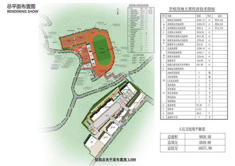 (二)拟建方案综合总经济技术指标为:校园总用地面积23687.15㎡,约35.5亩,其中,原校园总用地面积13923.55㎡,新增校园总用地面积9763.6㎡;总建筑占地面积5519.50㎡,其中,原校园总建筑占地面积3815.82㎡,新建风雨球场占地面积1279.64㎡,新建看台占地面积424.04㎡;总建筑面积17288.34㎡,其中,原校园建筑面积15878.7㎡,新建风雨球场1279.64㎡,新建看台130.00㎡,拟建天桥及架空室外踏步453.40㎡;新建200m环形跑道4根,100m直跑道4根,5人制足球场1个,篮球场地2个,排球场地1个,羽毛球场地2个,跳远场地1个,铅球场地1个;建筑密度23.30%;容积率0.73;绿地率30.6%;新增停车位7个。(详图见后)