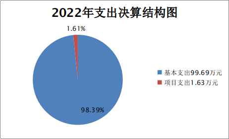 2022年本年支出合计101.32万元,其中:基本支出99.69万元,占98.39%;项目支出1.63万元,占1.61%;上缴上级支出0万元,占0%;经营支出0万元,占0%;对附属单位补助支出0万元,占0%。