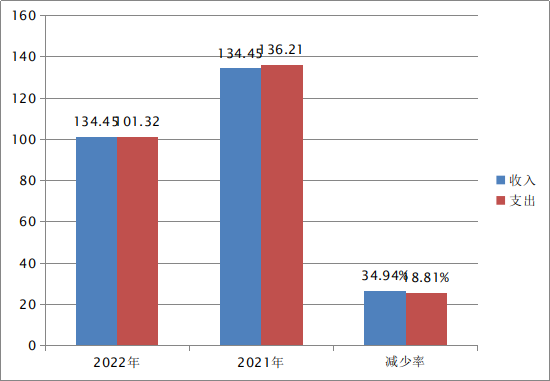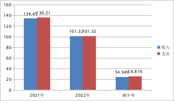 2022年度收入总计101.32万元、支出总计101.32万元。与2021年相比,收入总计减少33.13万元、支出总计减少34.89万元,收入减少24.64%,支出增加25.61%。主要是减少了刘和邦的死亡抚恤、人员减少和财政局未拨付的资金(即医疗保险、养老保险、公务接待费、差旅费等)。