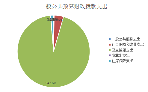 2022年一般公共预算财政拨款支出20063.54万元,主要用于以下方面:一般公共服务支出53.38万元,占0.27%;社会保障和就业支出833.65万元,占4.16%;卫生健康支出18891.38万元,占94.16%;农林水支出38.85万元,占0.19%;住房保障支出246.28万元,占1.23%。