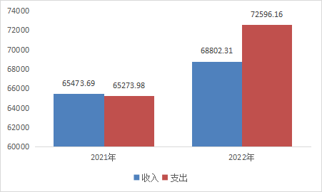 2022年度收入总计68802.31万元、支出总计72596.16万元。与2021年相比,收入总计增加3328.62万元、增长5.08%,支出总计增加7322.18万元,增长11.22%。主要变动原因是财政安排新冠肺炎疫情相关工作经费及医院业务楼等建设专项债券资金,医院医疗收入增加。