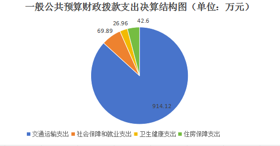 2022年一般公共预算财政拨款支出1053.57万元,主要用于以下方面:交通运输支出914.12万元,占86.77%;社会保障和就业支出69.89万元,占6.63%;卫生健康支出26.96万元,占2.56%;住房保障支出42.60万元,占4.04%。
