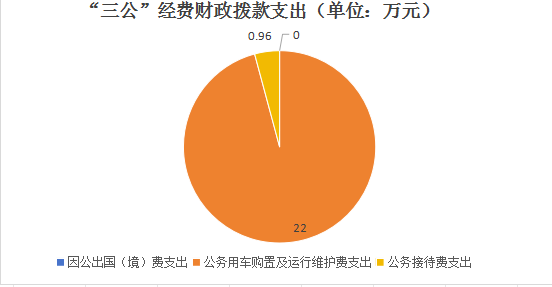 2022年“三公”经费财政拨款支出决算中,因公出国(境)费支出决算0万元,占0%;公务用车购置及运行维护费支出决算22万元,占95.82%;公务接待费支出决算0.96万元,占0.42%。具体情况如下:
