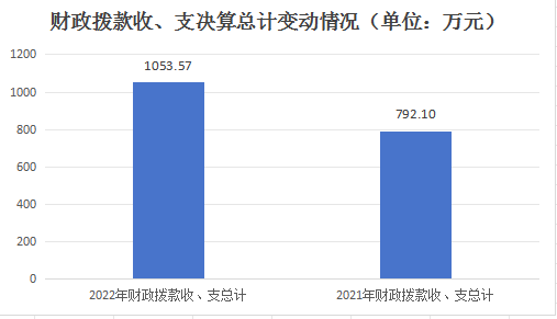 2022年度收、支总计1053.57万元。与2021年相比,收、支总计各增加261.48万元,增长33.01%。主要变动原因是人员人数增加,正常调资工资福利费增加、工业务费增加及项目增加。