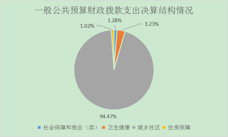 2022年一般公共预算财政拨款支出2528.41万元,主要用于以下方面:社会保障和就业支出32.40万元,占1.28%;卫生健康支出81.57万元,占3.23%;住房保障支出25.77万元,占1.02%;城乡社区支出2388.67万元,占94.47%。