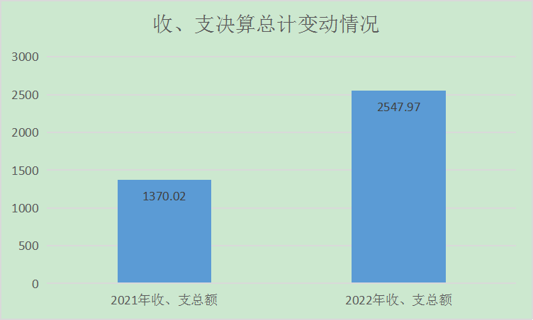 2022年度收、支总计2547.97万元。与2021年相比,收、支总计各增加1177.95万元,增长85.98%。主要变动原因是上年部分支出纳入本年支付形成。