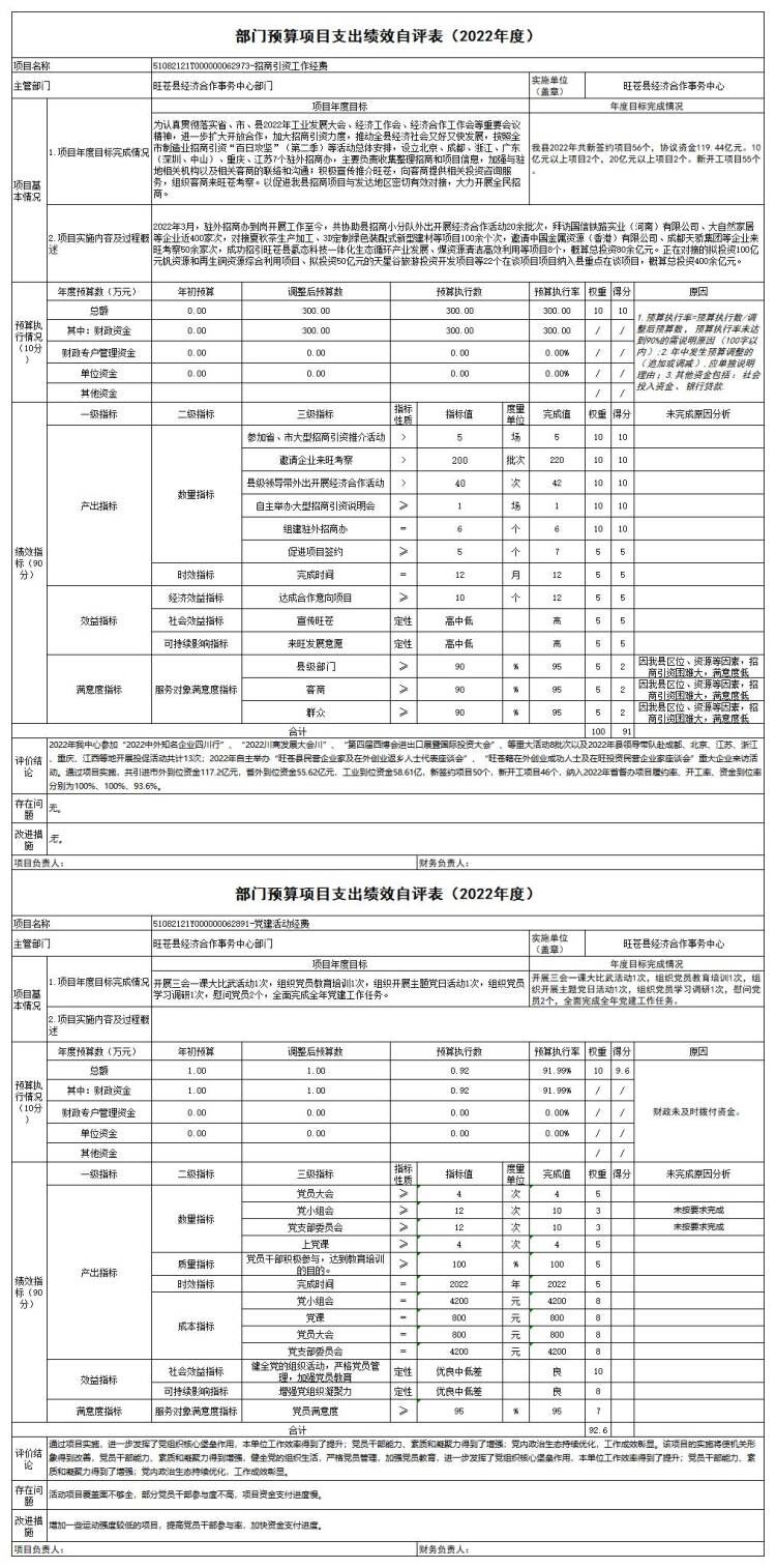 组织对2022年度一般公共预算、政府性基金预算、国有资本经营预算、社会保险基金预算以及资本资产、债券资金等全面开展绩效自评,形成县经济合作事务中心部门整体(含部门预算项目)绩效自评报告、招商引资专项预算项目绩效自评报告,其中,县经济合作事务中心部门整体(含部门预算项目)绩效自评得分为93.76分,绩效自评综述:2022 年我单位整体支出绩效自查自评结果良好,全年基本支出保证了部门的正常运转,项目支出保障了重点工作的开展。“招商引资专项经费”专项预算项目绩效自评得分为91分,绩效自评综述:2022年我单位项目支出绩效自查自评结果良好,全年项目支出保障了重点工作的开展。绩效自评报告详见附件。“党组织活动经费”专项预算项目绩效自评得分为92.6分,绩效自评综述:2022年我单位项目支出绩效自查自评结果良好,全年项目支出保障了重点工作的开展。绩效自评报告详见附件。