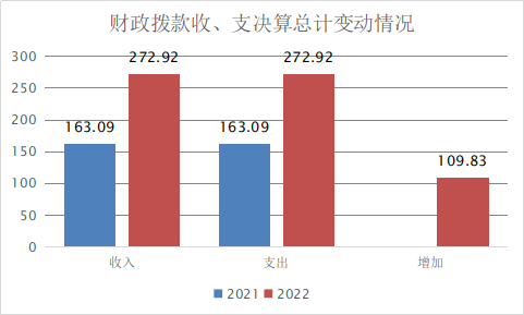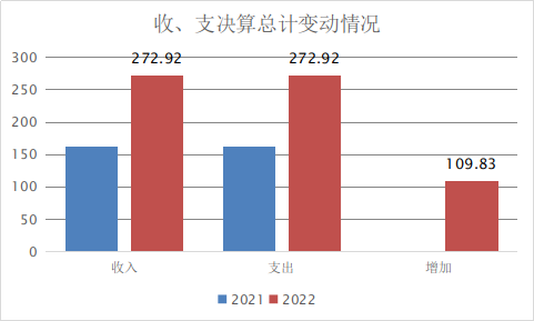 2022年度收、支总计272.92万元。与2021年相比,收、支总计各增加109.83万元,增长67.34%。主要变动原因是人员及老干部经费增加。